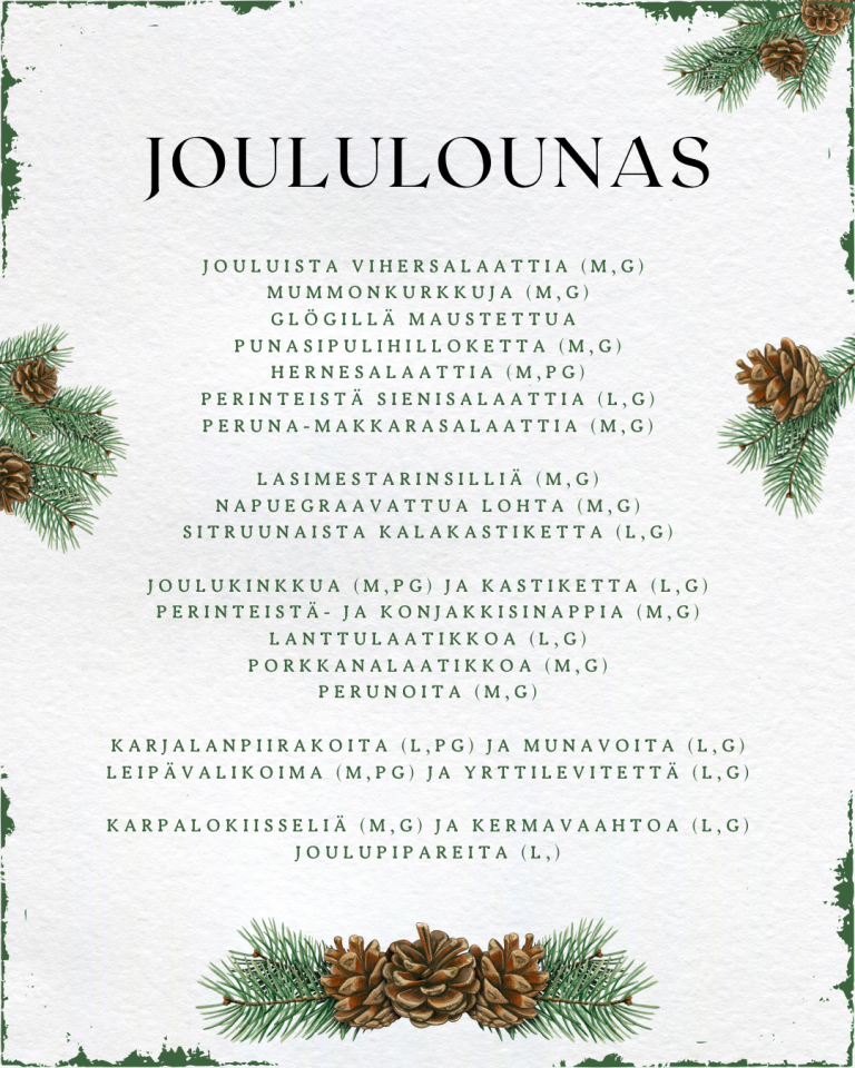 Joululounas Joululounas 30€/hlö, lapset 4-12v. 2€/ikävuosi, alle 4v. veloituksetta Teethän pöytävarauksen varmistaaksesi paikkasi ja ilmoitathan samalla erityisruokavaliot P. 044 2318532